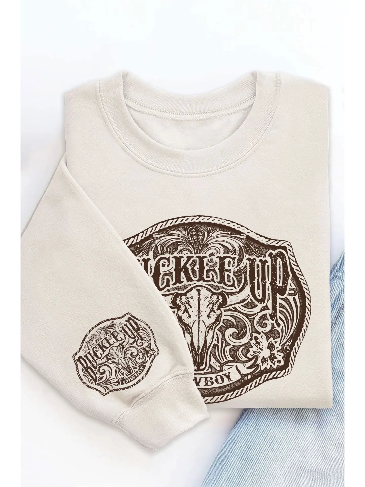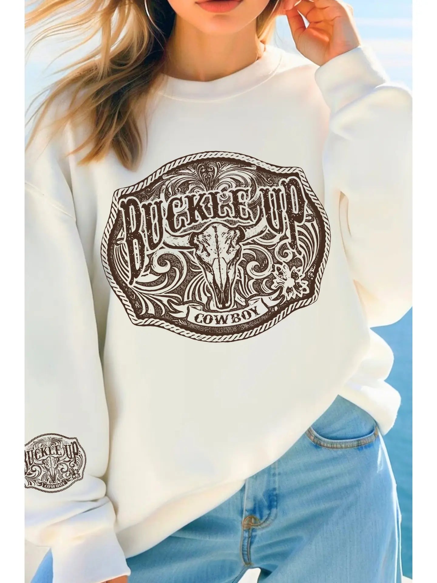 Rustee Clothing brand western woman's crewneck/sweatshirt perfect for evenings at rodeos! This sweatshirt has wrist cuffs and a waistband. The words "Buckle Up, Cowboy" appear on the chest and on one of the wrists.