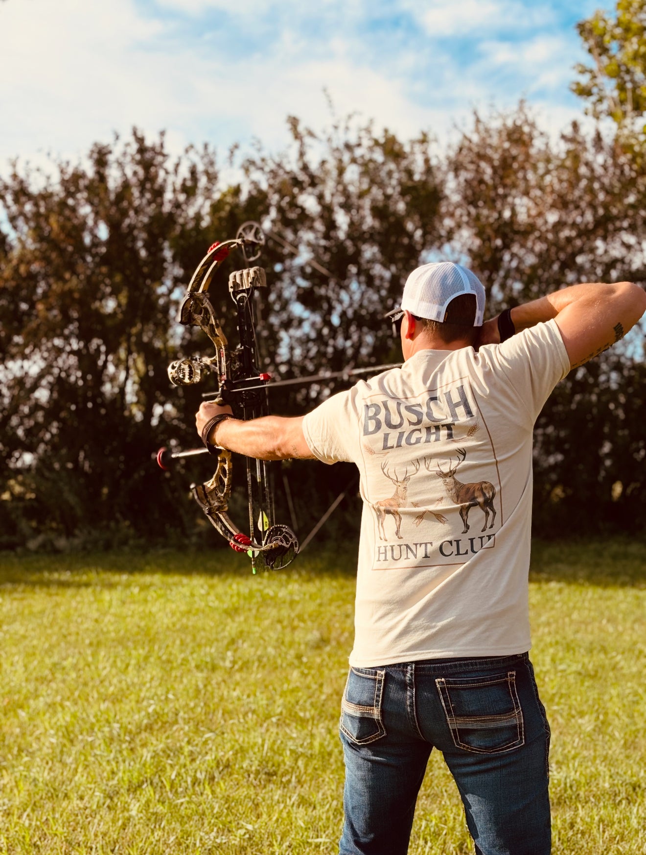 The Wild Buck Company men's Busch Light hunt club T-shirt is perfect for archery season! The design has the words "BUSCH LIGHT HUNT CLUB" and a buck and arrows. The T-shirt features a crew neck and short sleeves, and is available in a light tan color.