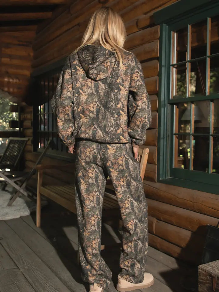 TICTOC women's wide leg classic camo sweatpants. These sweatpants have an elastic waist with a drawstring. It also has two deep roomy pockets and wide legs with no cuff at the ankles. The design is a classic camouflage with green, brown, and tan colors.