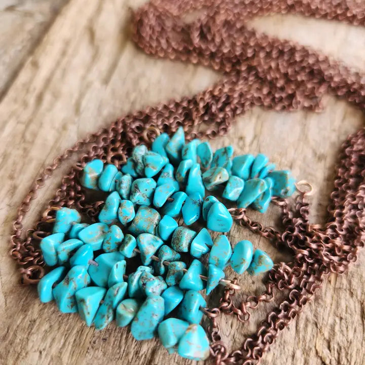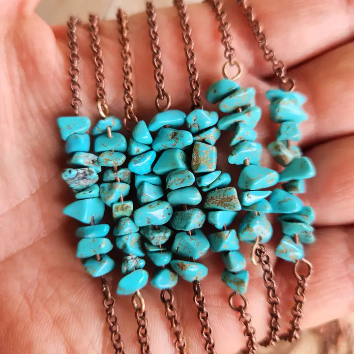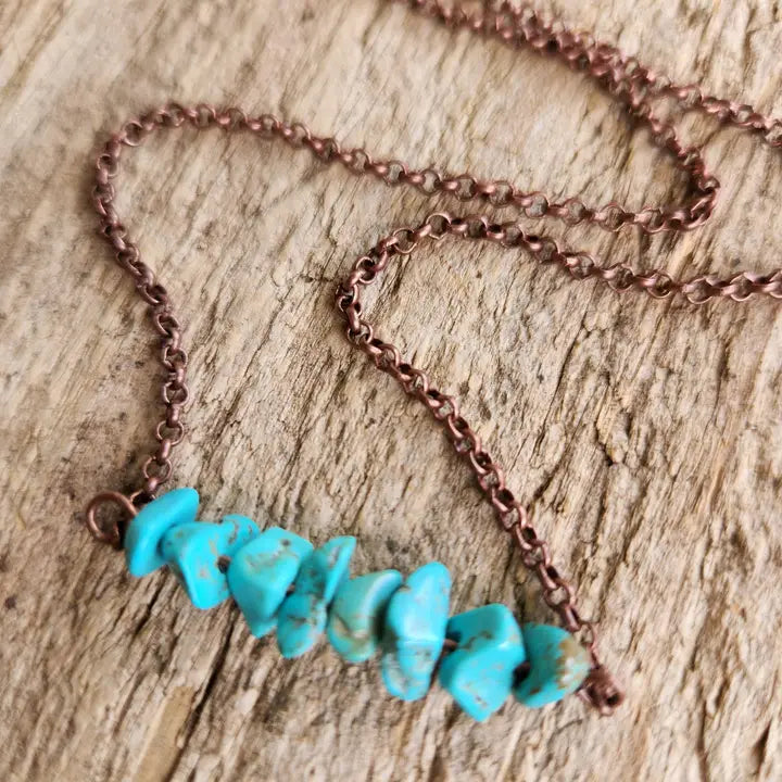 Fancy, elegant necklace for all of the turquoise lovers! The chain is copper in color. The bar is about one inch in length and is covered with turquoise stones. Cactus Creek handmade jewelry won't disappoint you!