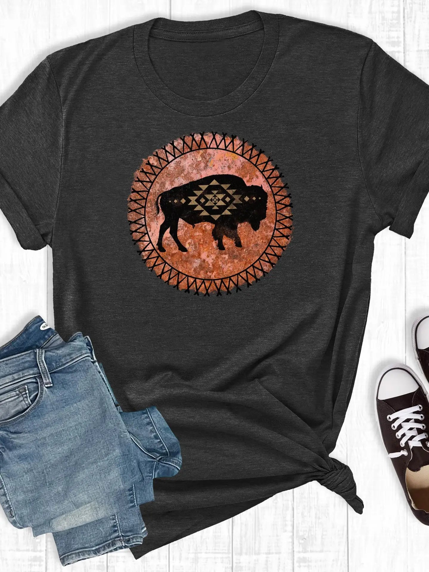 Rebel Rose Aztec-inspired buffalo woman's graphic T-shirt! The design consists of a black buffalo in an orangish-red circle with a black border around the edge. The T-shirt features short sleeves and a crew neck and comes in charcoal grey.