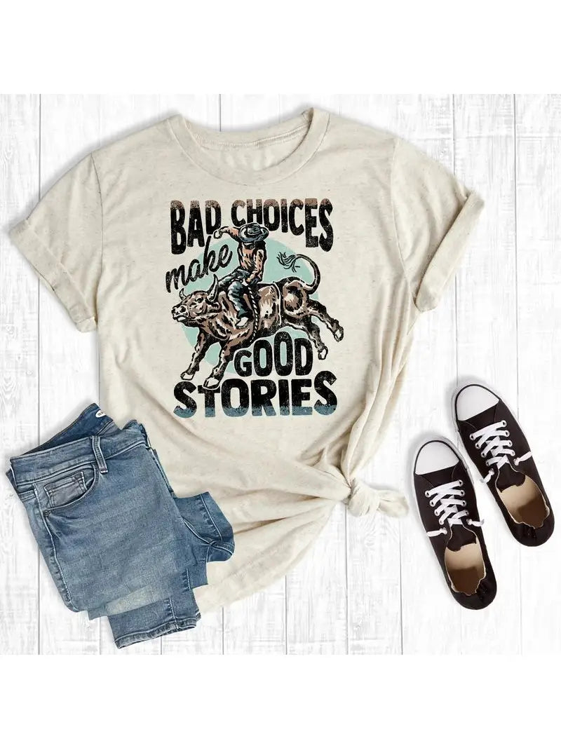 Rebel Rose woman's "BAD CHOICES make GOOD STORIES" graphic T-shirt! The design features a person riding a bull, along with the words "BAD CHOICES make GOOD STORIES." The design is multicolored on a whiteish tan T-shirt. It has short sleeves and a crew neck.