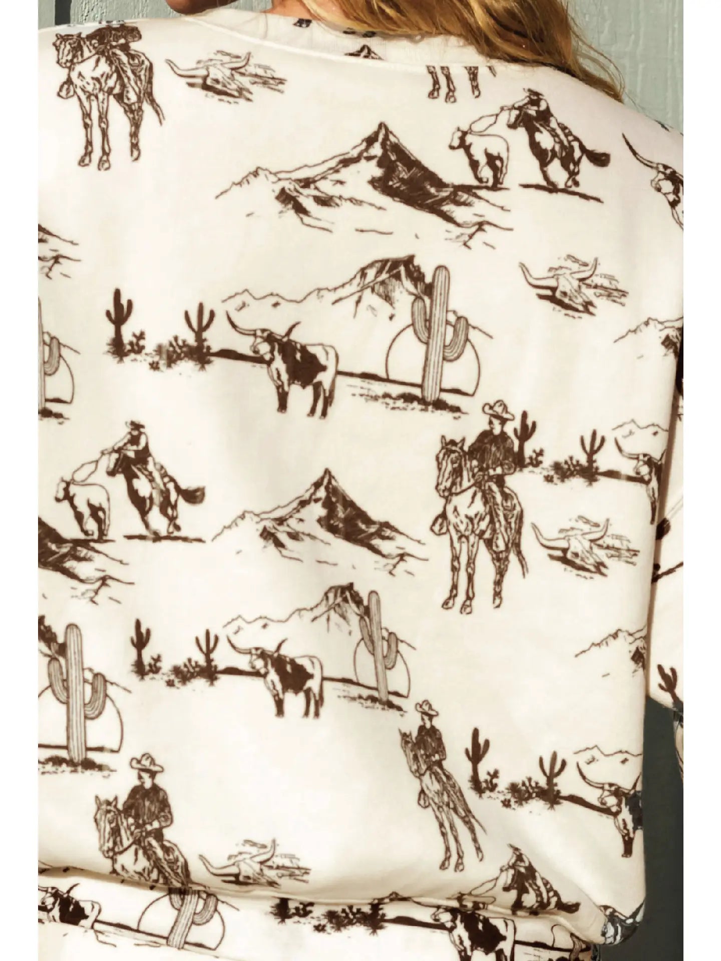 Women's crewneck sweatshirt/short matching set. This is sold as a two-piece set! This set has a brown Western design throughout on a cream/white colored crewneck sweatshirt and shorts.