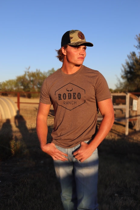 This is a Rodeo Ranch men's classic logo T-shirt. This tee is a crewneck with short sleeves and comes in heather brown. The words "RODEO RANCH" appear on the chest, and the lettering is black.